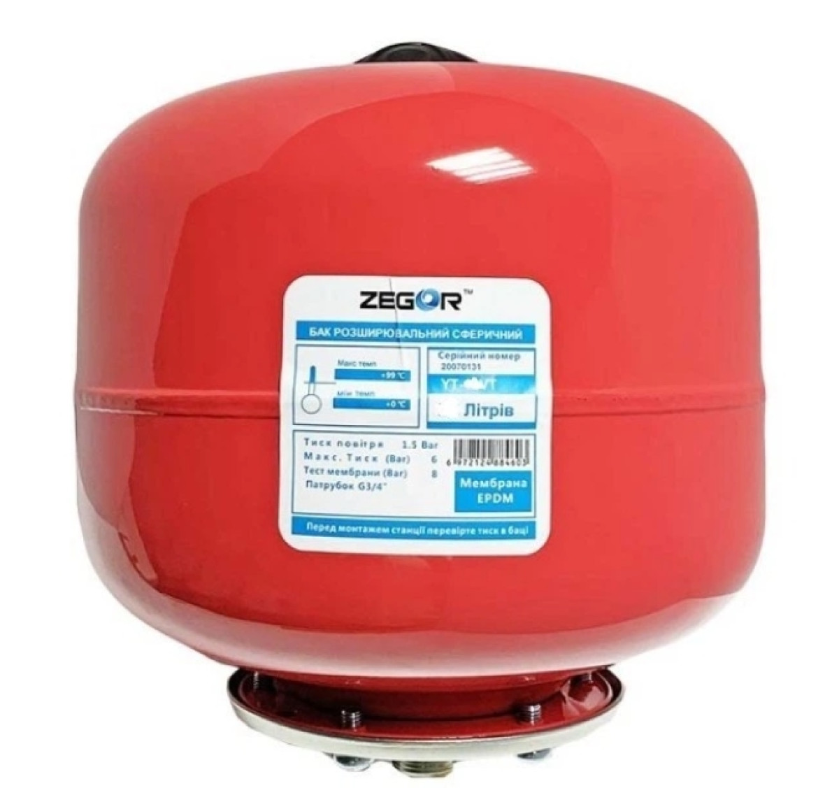 Бак розширювальний YT-19VT від ZEGOR — це мембранний бак (гідроакумулятор) об'ємом 19 літрів, призначений для використання у системах автономного водопостачання (для питної води) або опалення (як розширювальний бак). Індекс "VT" (Vertical Tank) вказує на вертикальне виконання бака, яке використовується для розміщення на підлозі або настінного кріплення. Бак забезпечує компенсацію гідроударів та накопичення запасу води для зниження частоти увімкнення насоса. Усередині бака знаходиться харчова мембрана (груша), яка відокремлює воду від повітряної камери. Корпус бака виготовлений із міцної сталі зі зносостійким покриттям. Об'єм 19 літрів є стандартним та найбільш поширеним для побутових насосних станцій, що обслуговують середні приватні будинки. YT-19VT є надійним та довговічним елементом системи, що забезпечує її стабільну та економічну роботу з достатнім запасом води для згладжування пікових навантажень та запобігання частим пускам насоса.