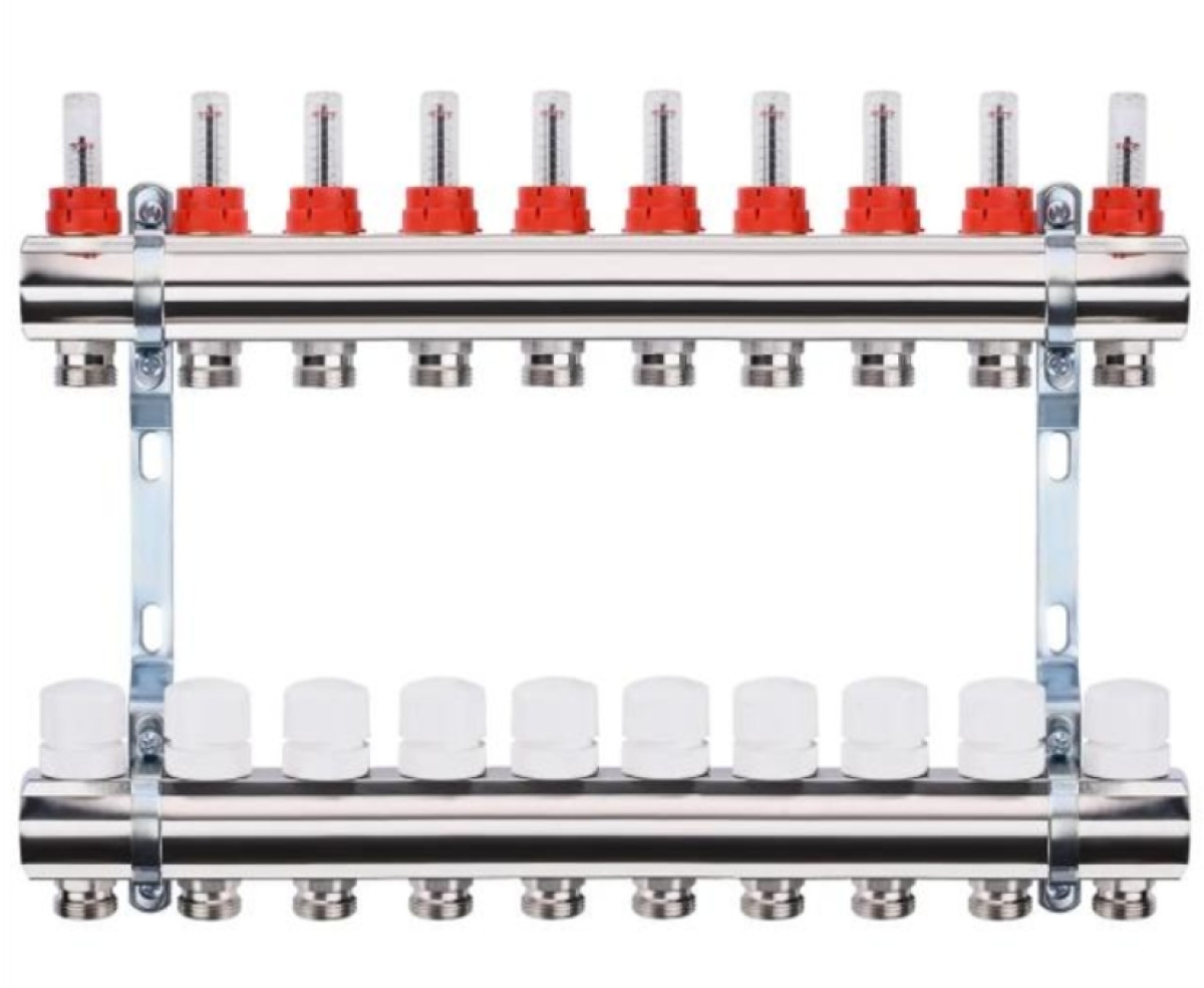 Так само перевага латуні перед нержавійкою і пластмасою полягає в тому, що вона дуже толерантна до різних механічних домішок у воді. Матеріал набагато повільніше руйнується при постійних ударах частинок сміття в стінки колектора теплої підлоги. Завдяки цьому термін служби виробу досягає 50 років. За рахунок наявності витратомірів регулюється інтенсивність подачі теплоносія в труби, що дає можливість вирівняти гідравлічний тиск на вході, тому всі контури віддають тепло з однаковою інтенсивністю.
