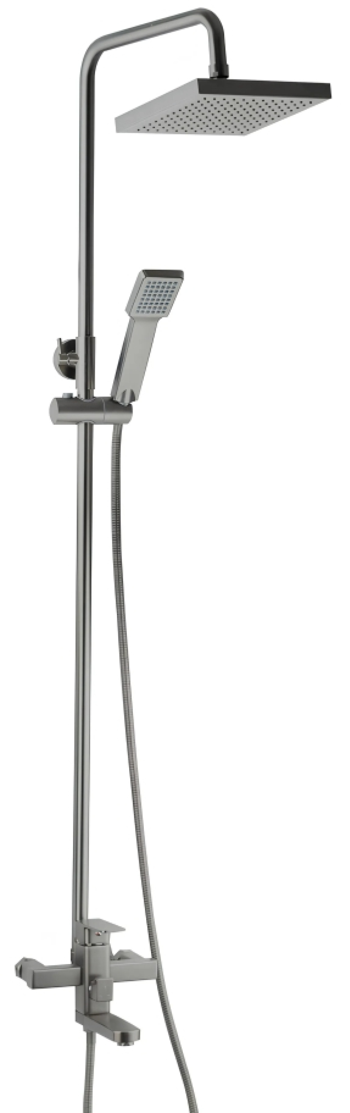 Душова система (стійка) з одноважільним змішувачем ZEGOR. Змішувач із латуні з покриттям Графіт (MG). Включає настінний змішувач, душову штангу (висота близько 110-115 см), верхній тропічний душ та ручну лійку зі шлангом. Забезпечує комфорт при прийнятті душу.