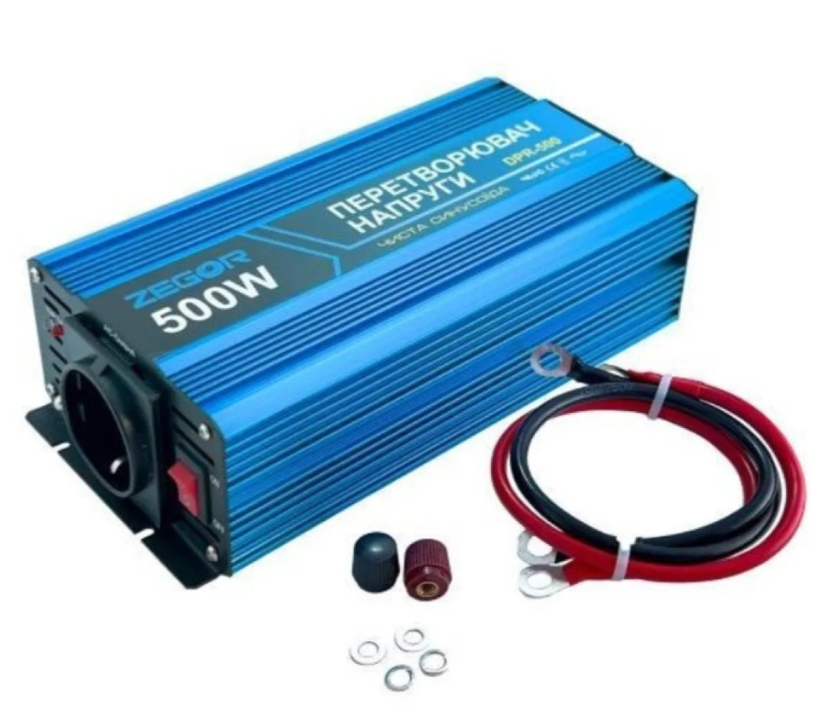 Інвертор ZEGOR. Перетворює 12В постійного струму на 220В змінного. Максимальна потужність 500 VA.