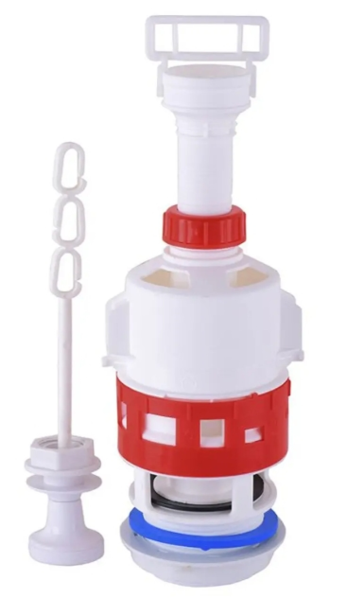 Універсальний зливний механізм (клапан) для бачка унітазу. Виробник, K.K.POL. (модель ZSO). Використовується для бачків низької установки та компактів. Клапан забезпечує регульований спуск води (однокнопковий або тяга) та часто має функцію Стоп.