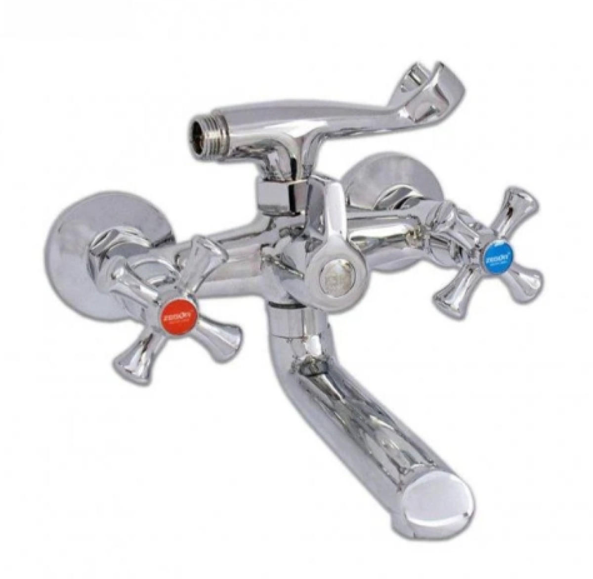 Настінний двозахватний (вентильний) змішувач для ванни ZEGOR (серія DML). Корпус із сплаву металів/силуміну. Хромоване покриття. Має поворотний вилив та керування за допомогою кран-букс. Бюджетна серія.
