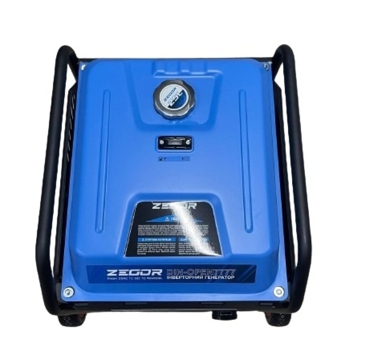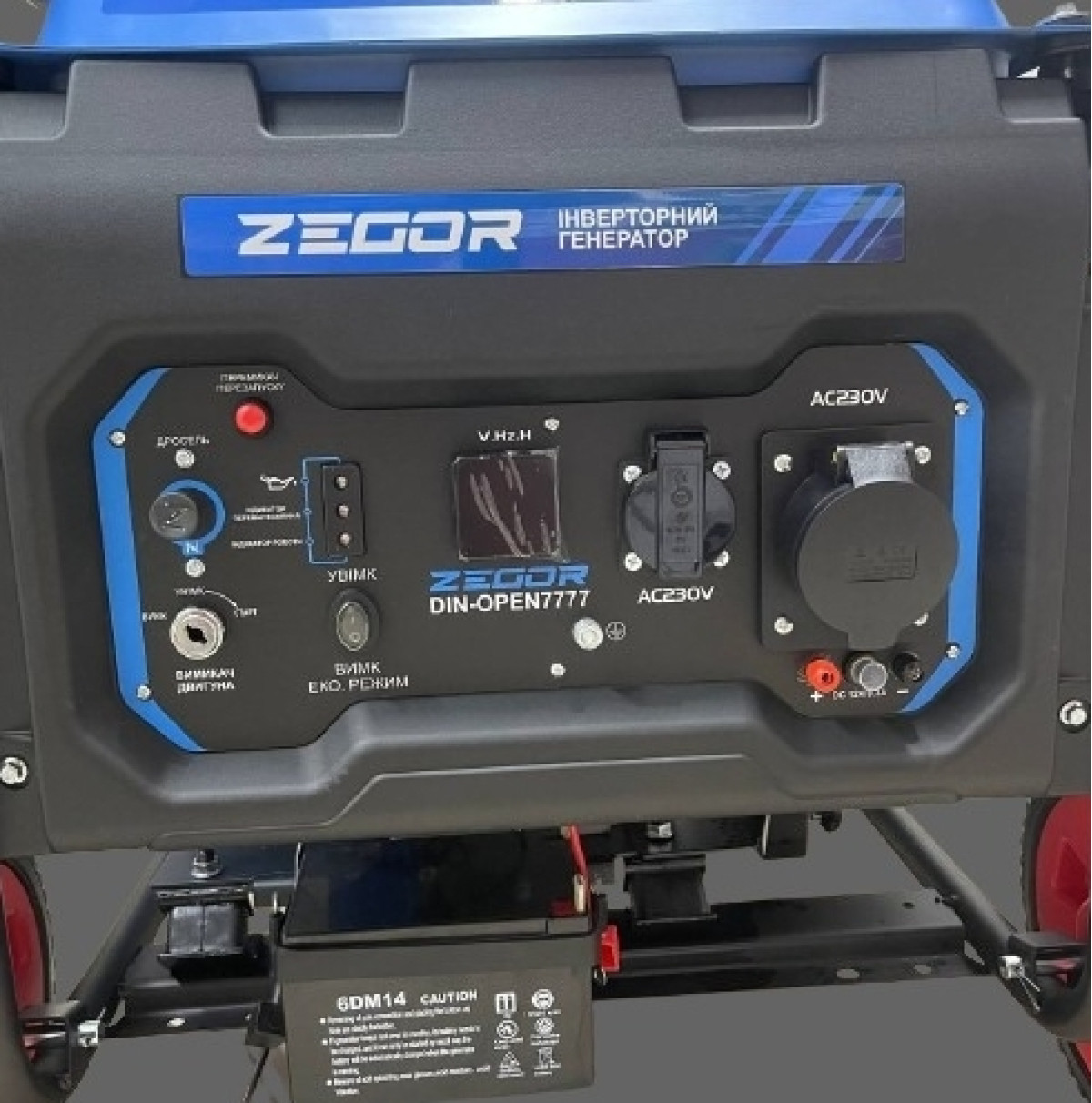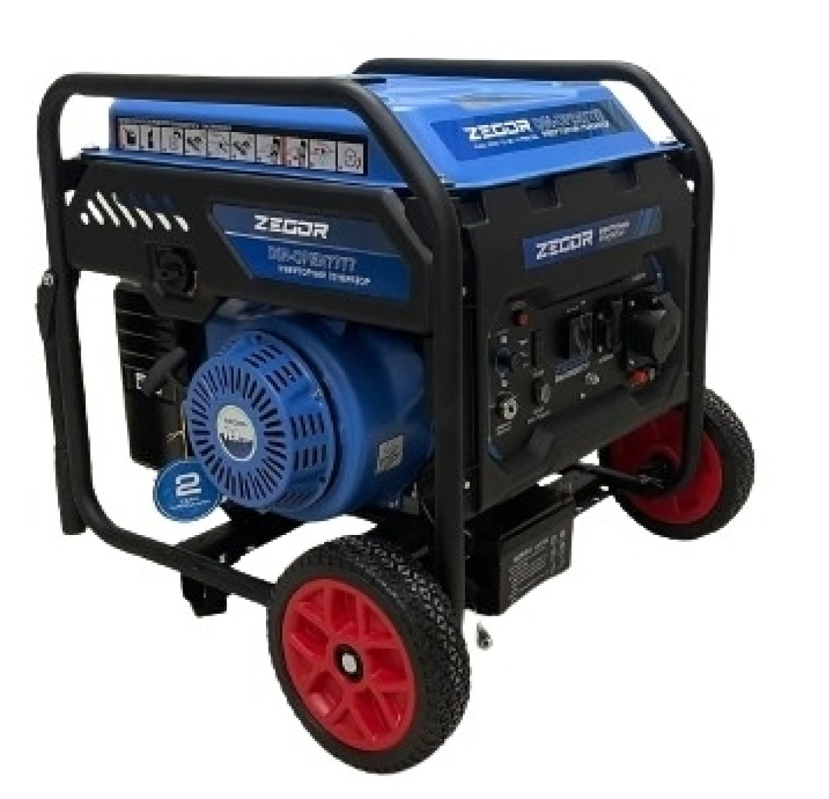 Потужний бензиновий інверторний генератор ZEGOR. Максимальна потужність 8.0 кВт, номінальна 7.5 кВт. Оснащений 4-тактним двигуном з мідними обмотками. Інверторна технологія забезпечує чисту синусоїду для чутливої техніки. Система запуску: електростартер та ручний стартер. Має великий паливний бак (25 л).