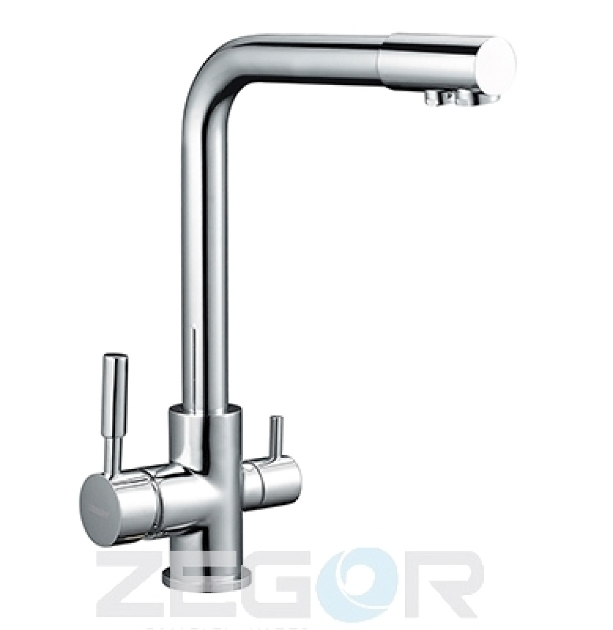 Одноважільний врізний змішувач для кухні ZEGOR (серія SAF). Корпус із латуні з хромованим покриттям. Особливість: два виливи в одному корпусі для подачі водопровідної та фільтрованої (питної) води. Монтаж на гайку.