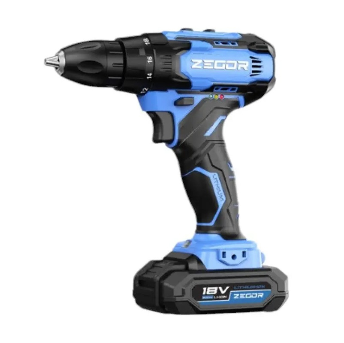 Акумуляторний щітковий шуруповерт ZEGOR. Напруга 18V. Має максимальний крутний момент 35 Н·м та дві швидкості (до 1350 об/хв). Оснащений швидкозатискним патроном 10 мм та регулюванням моменту 18+1.