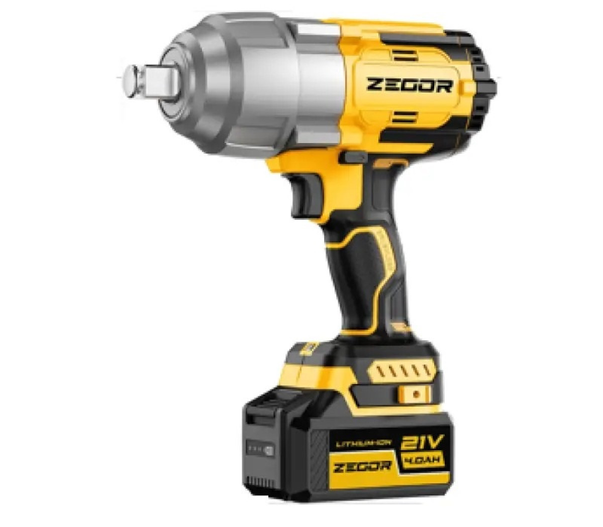 Акумуляторний ударний гайковерт ZEGOR. Оснащений безщітковим двигуном (BL). Напруга 21V, максимальний крутний момент 380 Н·м. Патрон: квадрат 1/2 дюйма. Має 3 режими швидкості та електронне регулювання.