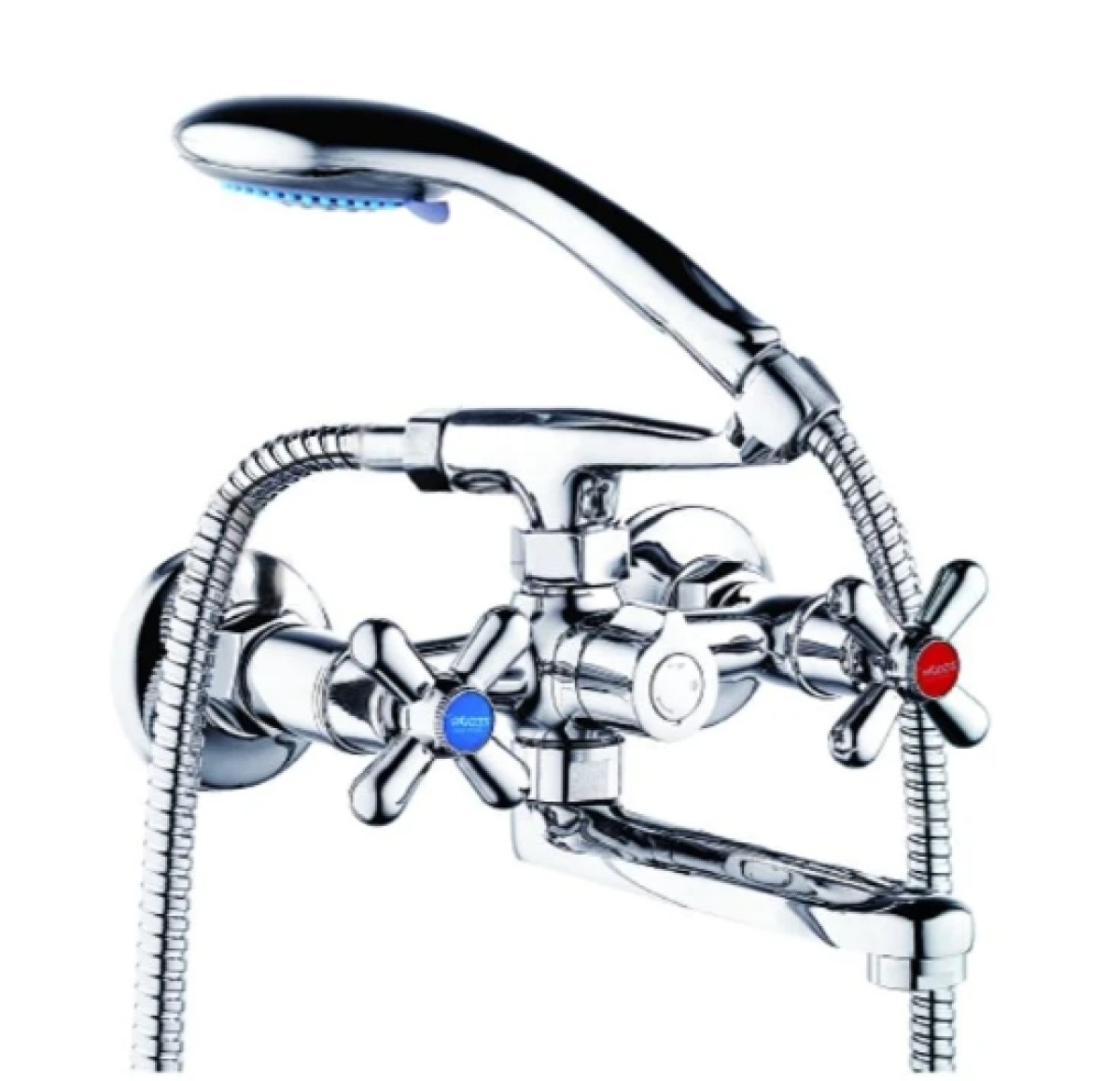 Настінний двовентильний (двозахватний) змішувач для ванни ZEGOR (серія DST). Корпус зі сплаву/силуміну (A827) з хромованим покриттям. Керування за допомогою кран-букс. Має поворотний вилив та комплектується душовим набором.