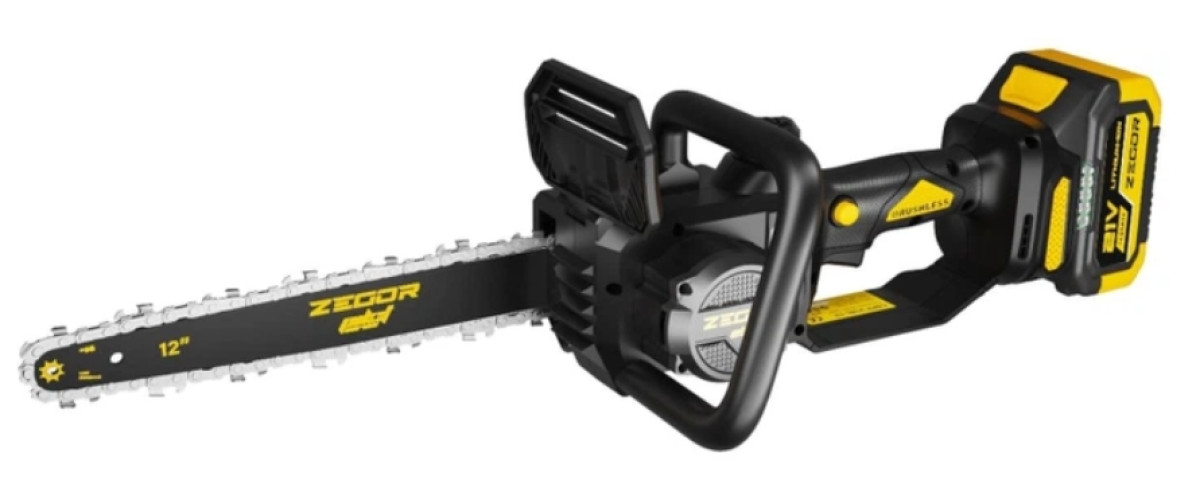 Акумуляторна безщіткова (BL) ланцюгова пила ZEGOR. Напруга 21V. Довжина шини 12 дюймів (30 см). Серія CSPP (Premium Chainsaw). Підходить для обрізки, заготівлі дров та будівництва.