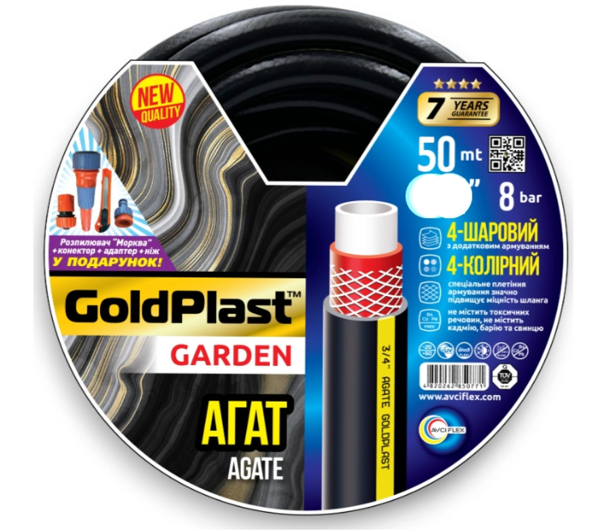 Тришаровий армований садовий шланг "Агат". Діаметр 3/4 дюйма, довжина 50 метрів. Використовується для поливу, відрізняється хорошою міцністю та стійкістю до зношування.