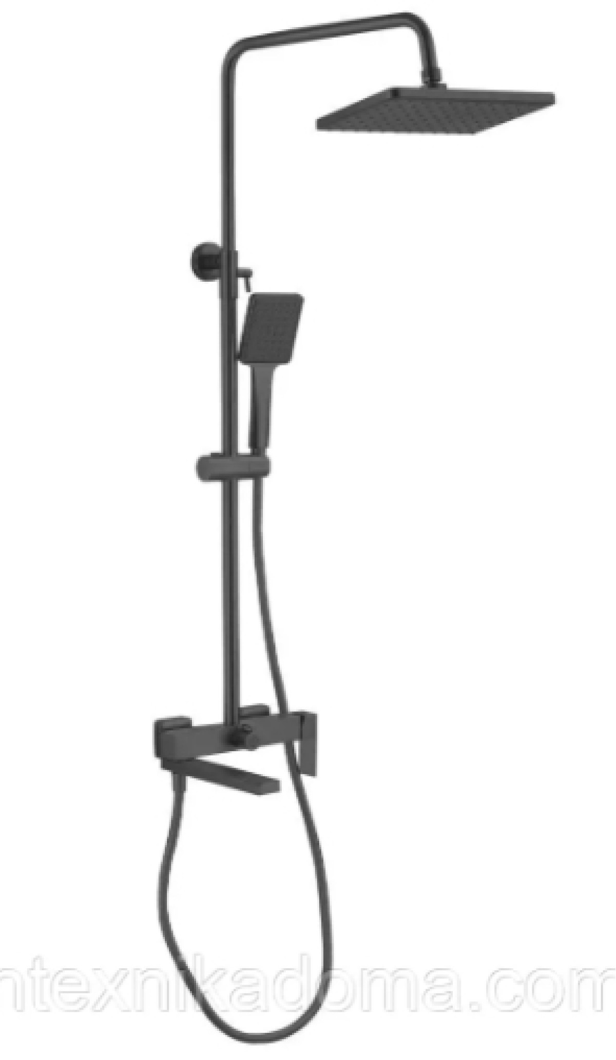Душова система (стійка) TROYA (серія DEVON). Змішувач з одноважільним керуванням. Корпус змішувача із латуні/сплаву у чорному матовому кольорі (KB). Включає верхній тропічний душ та ручну лійку.