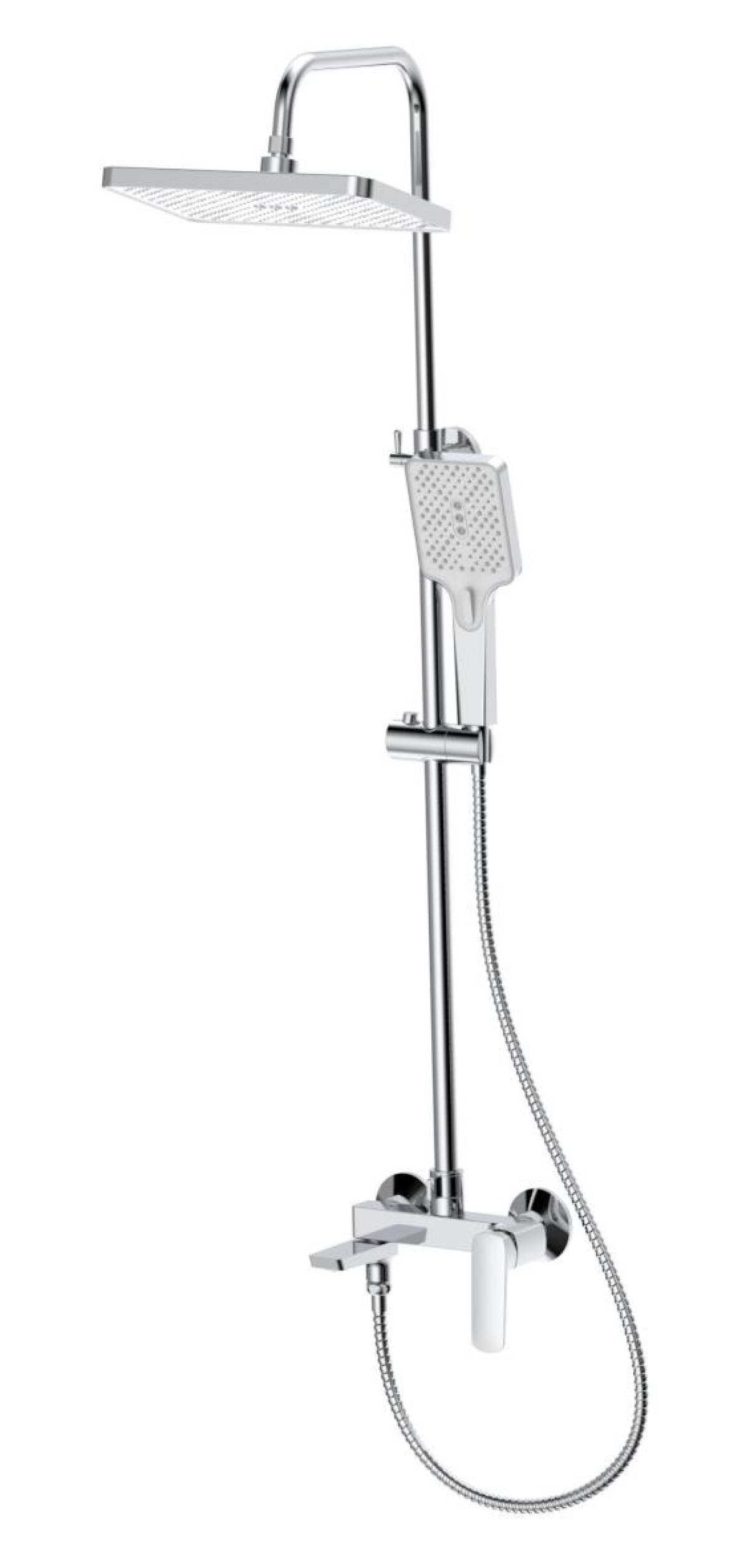 Душова система (стійка) TROYA (серія LUZON). Змішувач з одноважільним керуванням. Корпус змішувача із латуні/сплаву з хромованим покриттям. Включає верхній тропічний душ та ручну лійку.