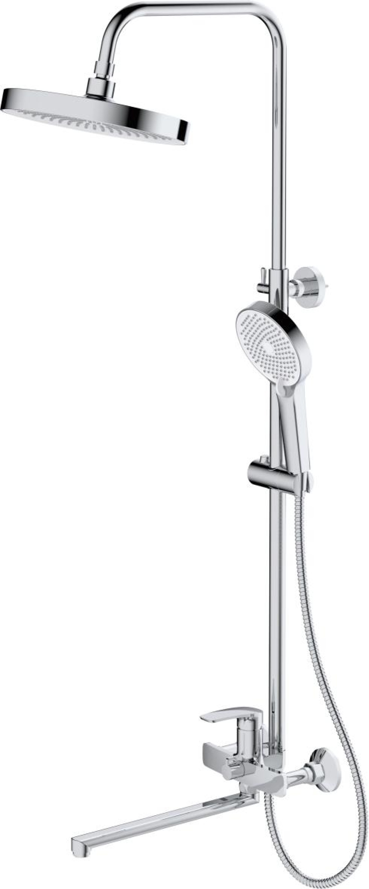 Душова система (стійка) TROYA (серія MARAJO). Змішувач з одноважільним керуванням. Корпус змішувача із латуні/сплаву з хромованим покриттям. Включає верхній тропічний душ та ручну лійку.