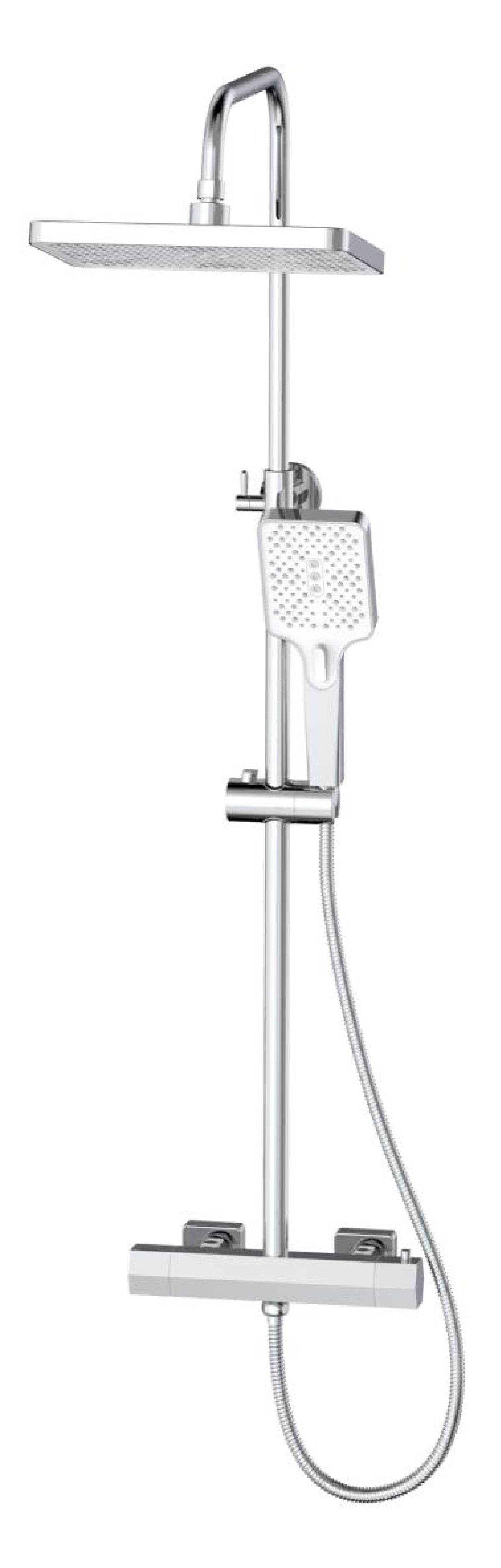 Душова система (стійка) TROYA (серія SICILIA). Змішувач з одноважільним керуванням. Корпус змішувача із латуні/сплаву з хромованим покриттям. Включає верхній тропічний душ та ручну лійку.