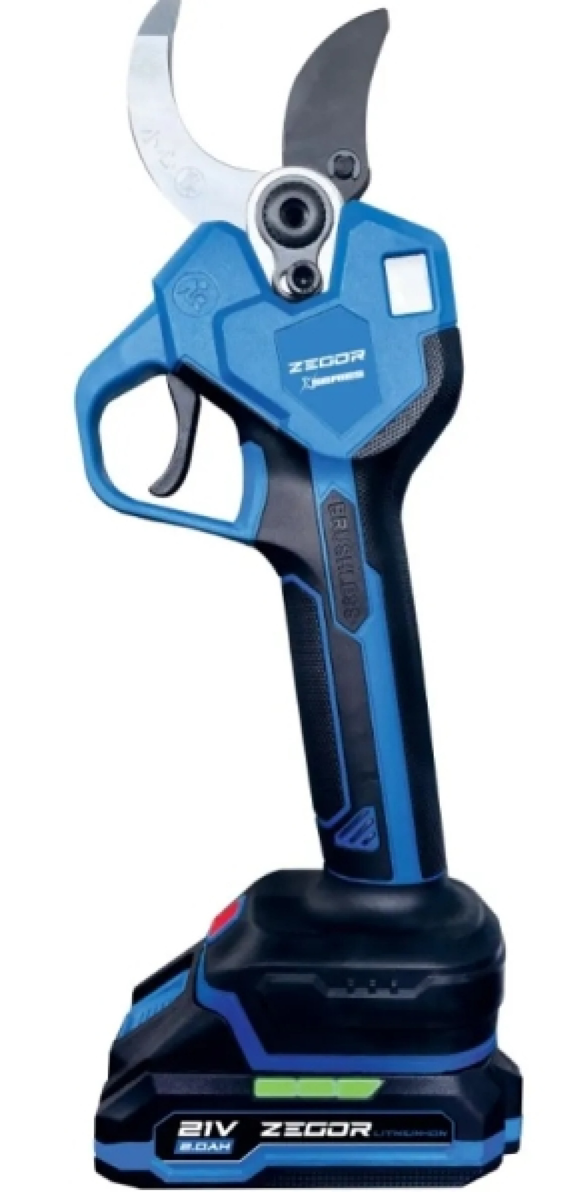 Акумуляторний безщітковий секатор ZEGOR. Напруга 21V. Діаметр різу 40 мм. Висока потужність для професійного садівництва.