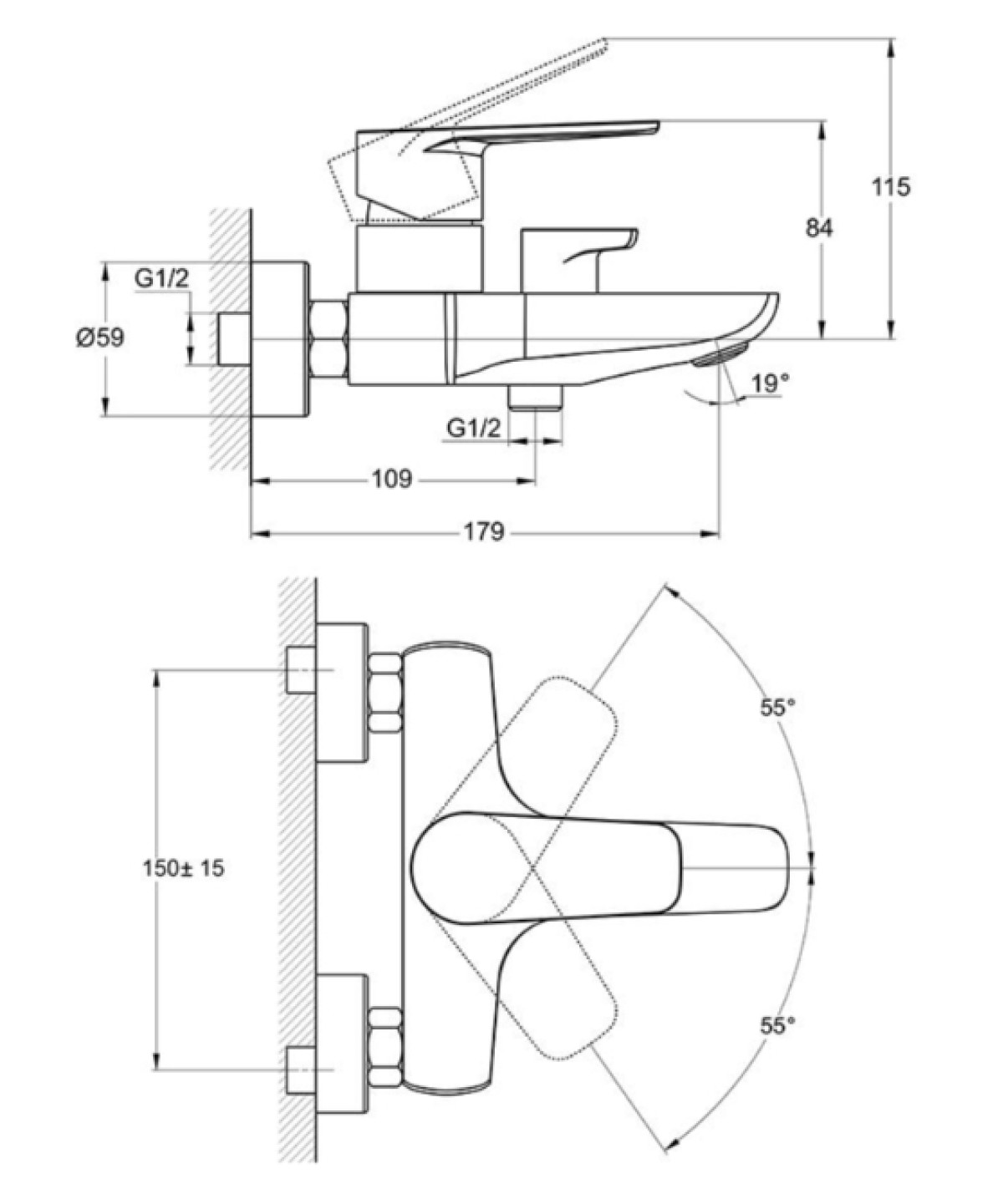 - Тип: Змішувач для ванни, настінний, одноважільний.