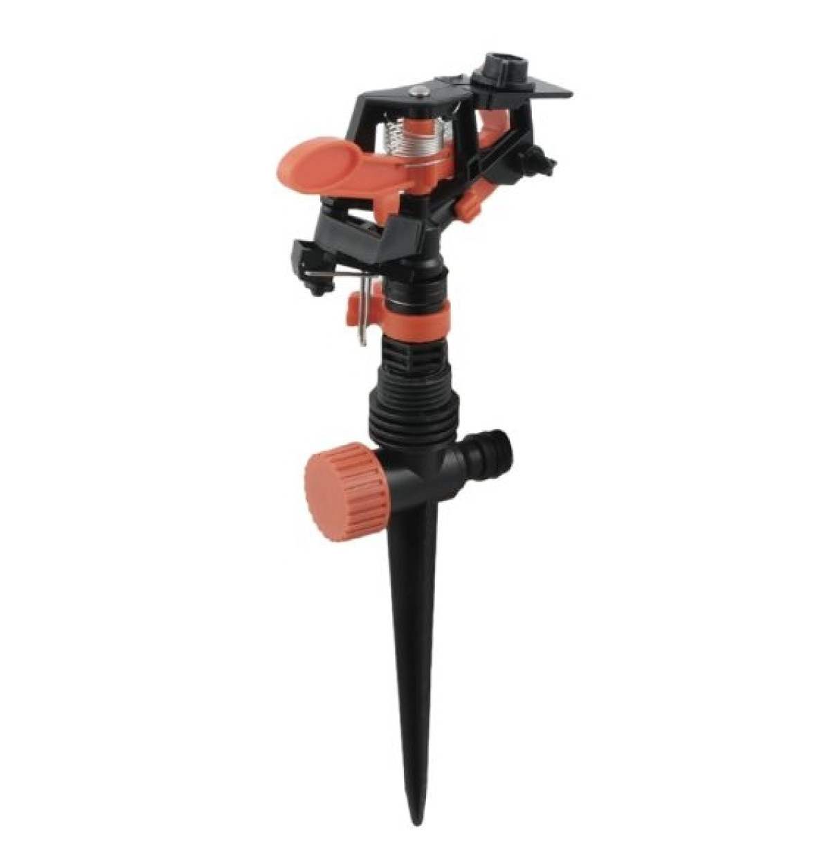 Ороситель импульсный UKR-028 (или осциллирующий) — это стационарный дождеватель, предназначенный для кругового или секторного полива больших территорий с помощью мощной струи воды. Принцип действия основан на импульсном выбросе струи (за счет удара воды о специальную лопасть), который, отталкивая механизм, обеспечивает медленное вращение дождевателя. Это позволяет воде проникать глубоко в почву и обеспечивает большой радиус полива (до нескольких десятков метров), который можно настроить по углу и дальности. Ороситель изготовлен из прочного пластика (или комбинации пластика и металла) и устанавливается на грунт (на штыре) или на подставку. Подключается к шлангу через быстросъемный коннектор. Модель UKR-028 является высокоэффективным решением для полива газонов и спортивных площадок. Его конструкция устойчива к ветру и обеспечивает равномерное покрытие большой площади. Настройка сектора полива позволяет исключить попадание воды на дорожки или стены.