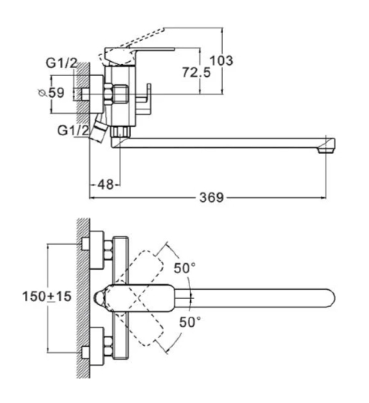 - Тип: Змішувач для ванни, настінний, одноважільний.