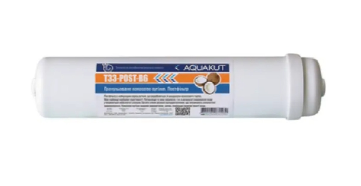 Линейный быстросъемный картридж (постфильтр) T-33-POST-B6. Наполнитель — гранулированный активированный кокосовый уголь. Используется как финишная ступень очистки для удаления остаточного хлора, газов и коррекции вкуса/запаха воды.