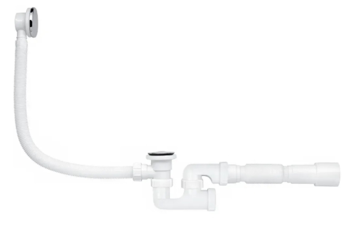 Сантехнический сифон для ванн с системой слива-перелива Click-Clack. Имеет регулируемый (вероятно, трубный) выпуск и перелив. Диаметр выпуска в канализацию 50 мм.