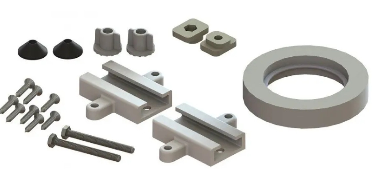 Комплект крепежа с прокладкой для установки пластикового бачка на керамическую чашу унитаза. Состоит из пластиковых болтов, гаек и резиновой прокладки для герметичности.