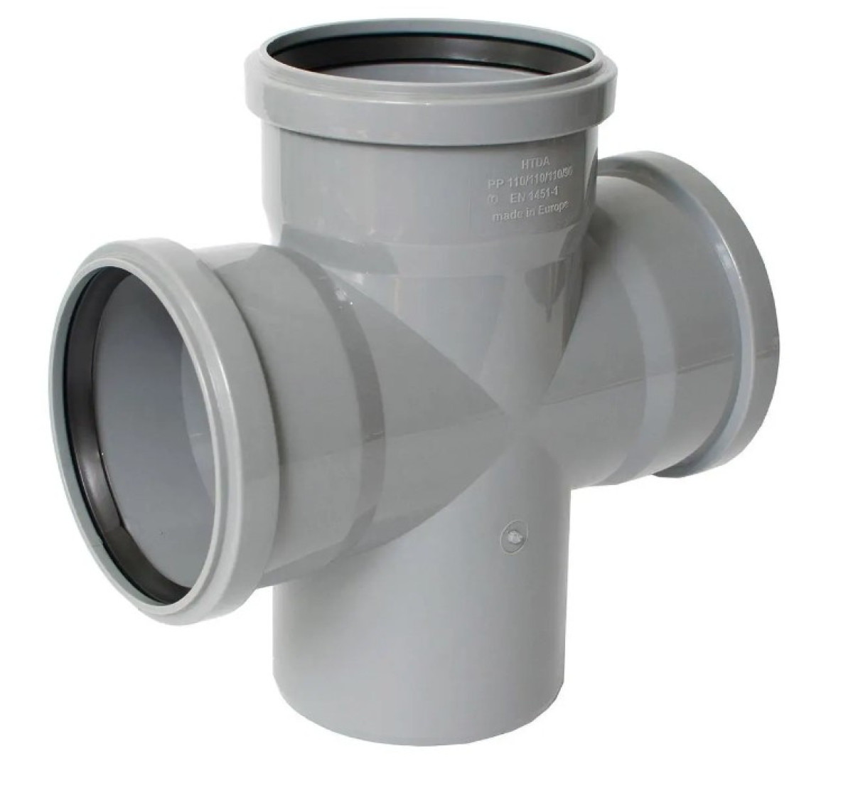 Крестовина 110/110/110/90 — фитинг для создания четырехстороннего разветвления на трубах 110 мм под углом 90 градусов. Используется для сложной разводки на главном стояке.